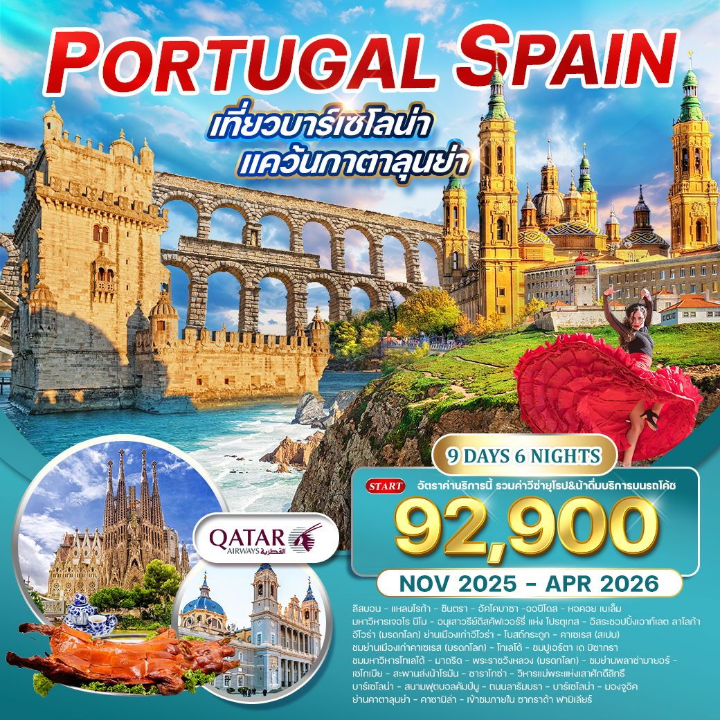 เที่รยวโปรตุเกส ลิสบอน – แหลมโรก้า – ซินตรา – อัคโคบาซา –ออบิโดส – เดินเล่นเมืองเก่า หอคอย เบเล็ม – มหาวิหารเจอโร นิโม – อนุเสาวรีย์ดิสคัฟเวอร์รี่ แห่ง โปรตุเกส อีโวร่า (มรดกโลก) ย่านเมืองเก่าอีโวร่า – โบสถ์กระดูก – คาเซเรส (สเปน) คาเซเรส – ชมย่านเมืองเก่าคาเซเรส (มรดกโลก) มาดริด – พระราชวังหลวง (มรดกโลก) – ชมเมืองหลวง ซาราโกซ่า – วิหารแม่พระแห่งเสาศักดิ์สิทธิ์ – บาร์เซโลน่า สนามฟุตบอลคัมป์นู – ถนนลารัมบรา บาร์เซโลน่า – มองจูอิค – ย่านคาตาลุนย่า – คาซามิล่า โทเลโด้ – ชมปูเอร์ตา เด บิซากรา – ชมมหาวิหารโทเลโด้ – มาดริด ชมย่านพลาซ่ามายอร์ – ทานมื้อค่ำพร้อมชมระบำฟลามิงโก้ มาดริด – เซโกเบีย – สะพานส่งน้ำโรมัน – ซาราโกซ่า เข้าชมภายใน ซากราด้า ฟามิเลียร์ – อิสระชอปปิ้งเอาท์เลต ลาโลก้า เมนูพื้นเมืองยอดนิยม หมูหันสเปน
